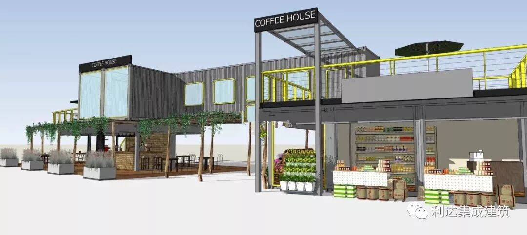 这个咖啡店是临建,因此有甲方用集装箱来建造售楼处。集装箱是环保建筑,快速建造,可循环再用,租地到期完毕后,既可整体转移到下一个基地继续利用,也可留在原地改为配套公建,因此集装箱确实比其他建造形式更适用于临时咖啡店。