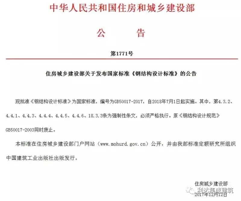 同时,《钢结构设计标准》GB50017-2017也一起发布!该标准将自2018年7月1日起正式实施!